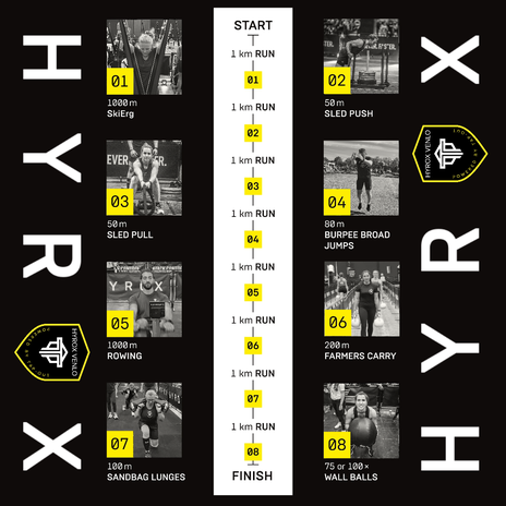 HYROX is een indoor competitie waar functionele oefeningen en uithoudingsvermogen gecombineerd worden. De competitie begint met 1 km rennen, gevolgd door 1 functionele oefening. Deze reeks word acht keer herhaald.